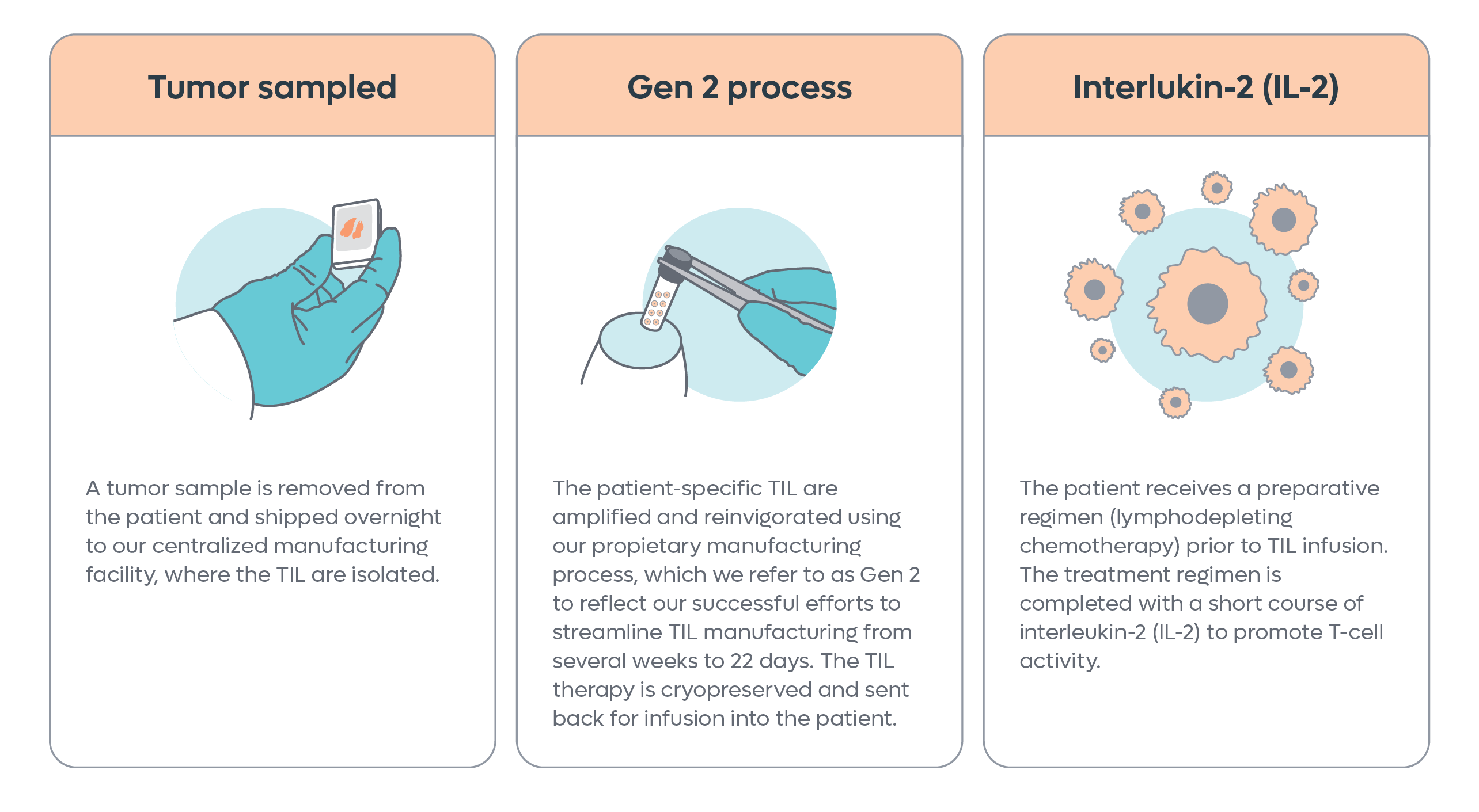 First, you will be evaluated by your oncologist to see if you are a good match for TIL therapy. If yes, your treatment’s progression looks like this: